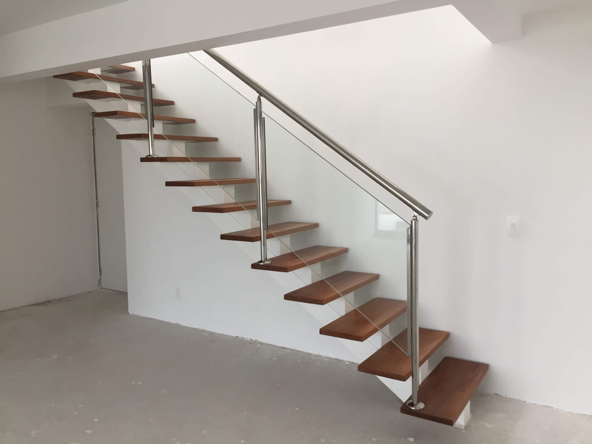 A ideia era entregar aos proprietários uma escada que já atendesse o padrão do condomínio e como item de personalização, opções de guarda corpos em aço inox com fechamento de vidros.