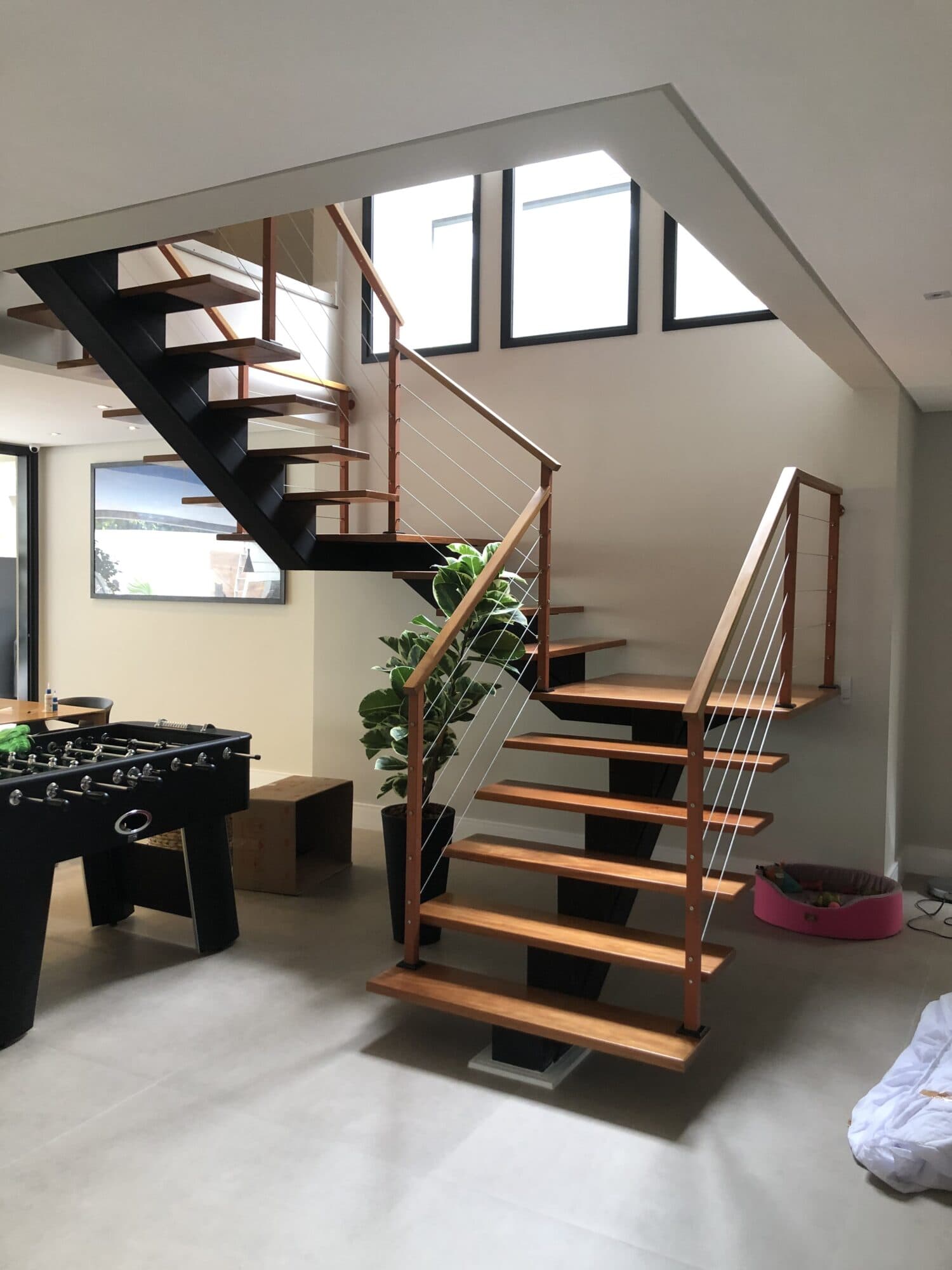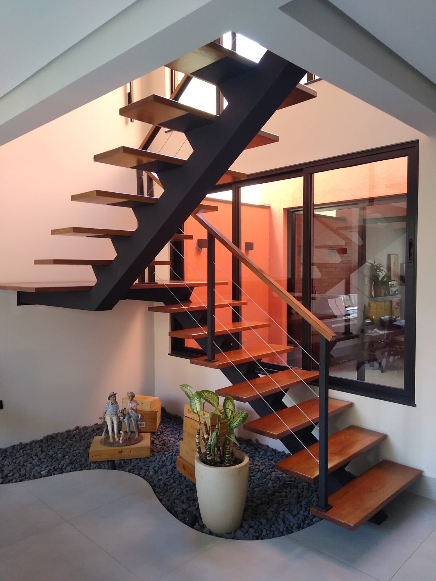 Nesse modelo com viga centralizada, as laterais da escada ficam livres, deixando os degraus em balanço, o que gera um aspecto moderno e arrojado, pois dá a impressão de leveza, de que os degraus estão “flutuando”.