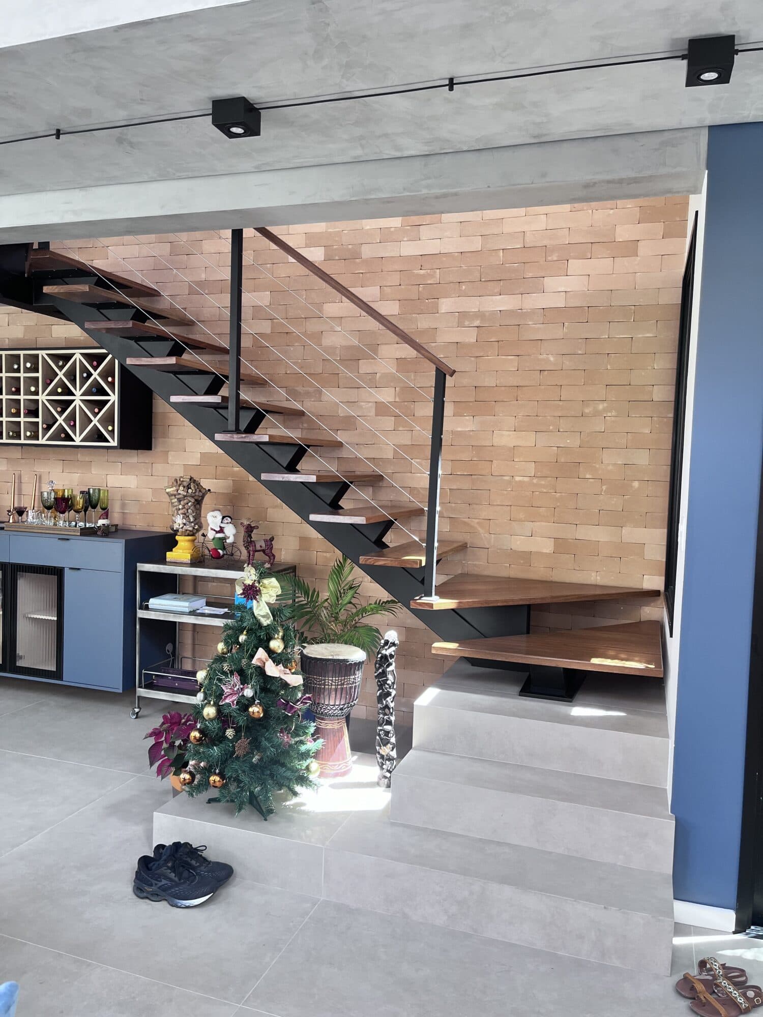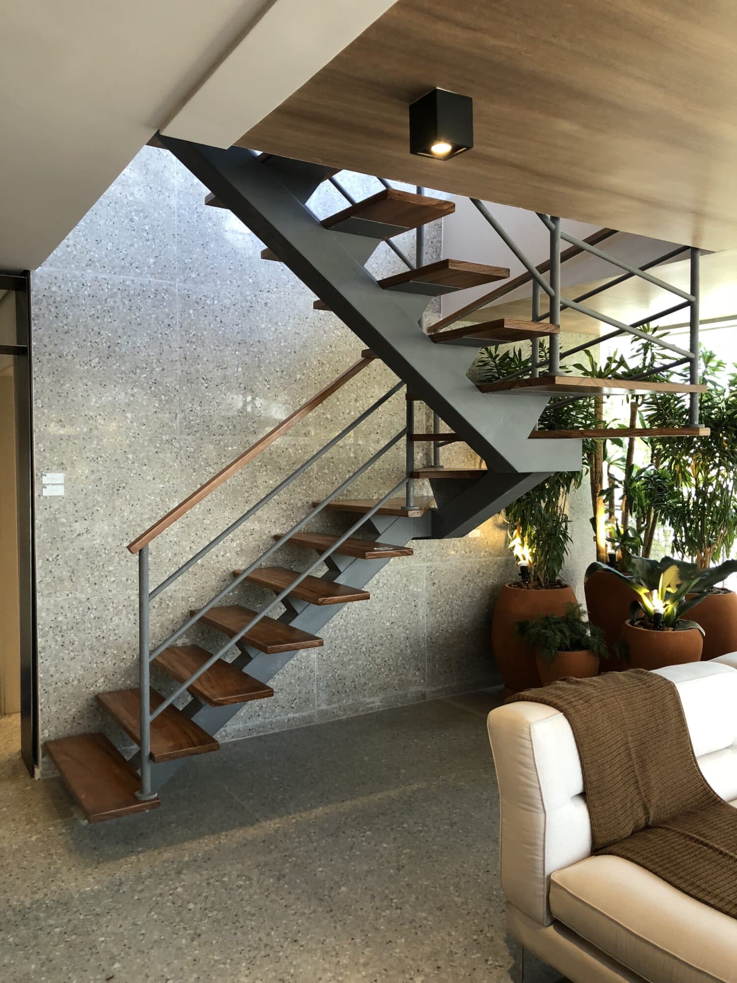 A escada com viga central, ou escada espinha de peixe, é estruturada em uma única viga que apoia os degraus pelo centro.