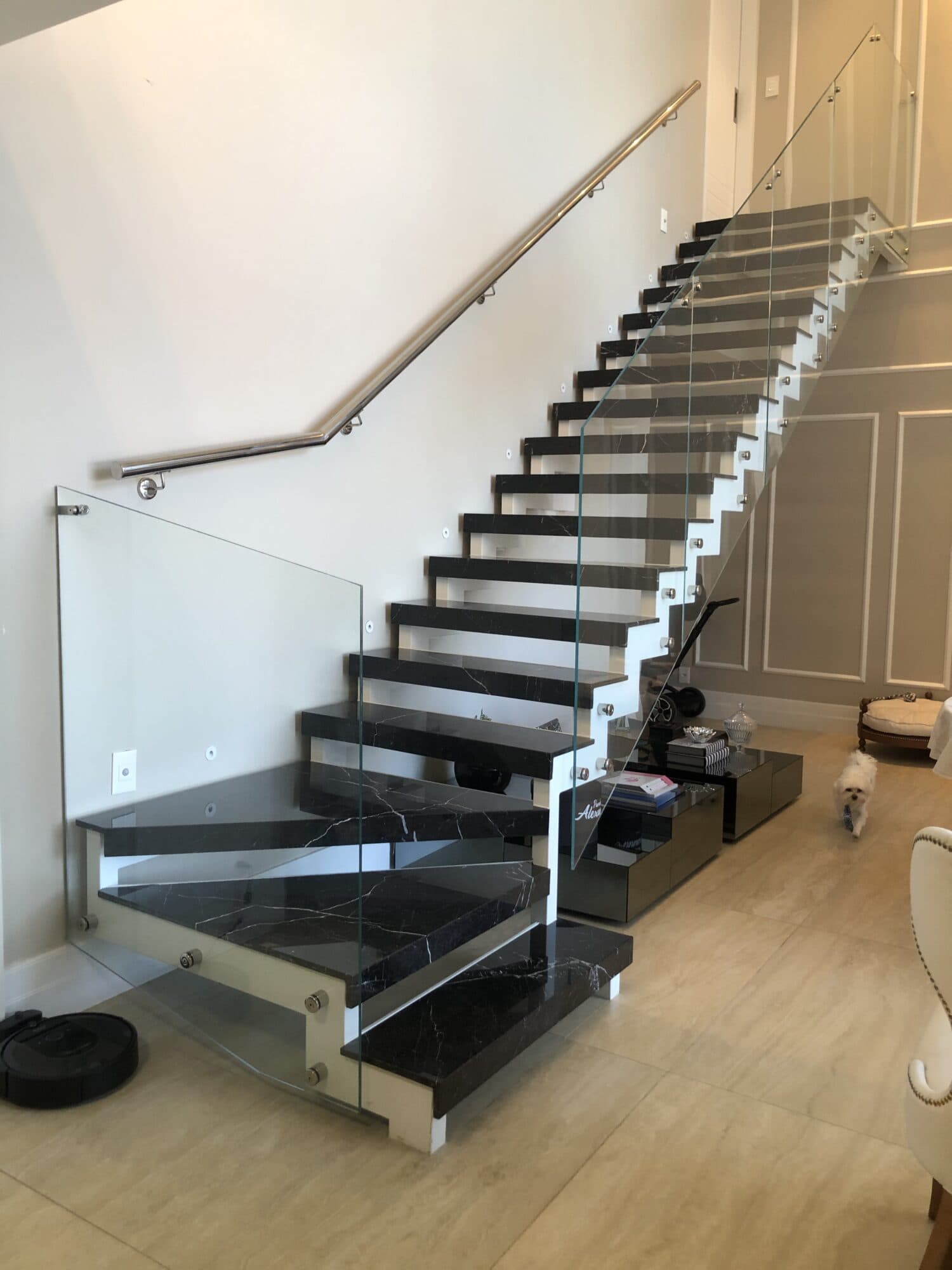 Os degraus da escada de ferro são confeccionados em chapa metálica, prontos para serem revestidos com materiais como: madeira, granito, mármore entre outros, ou até serem mantidos metálicos, deixando um aspecto mais rústico.