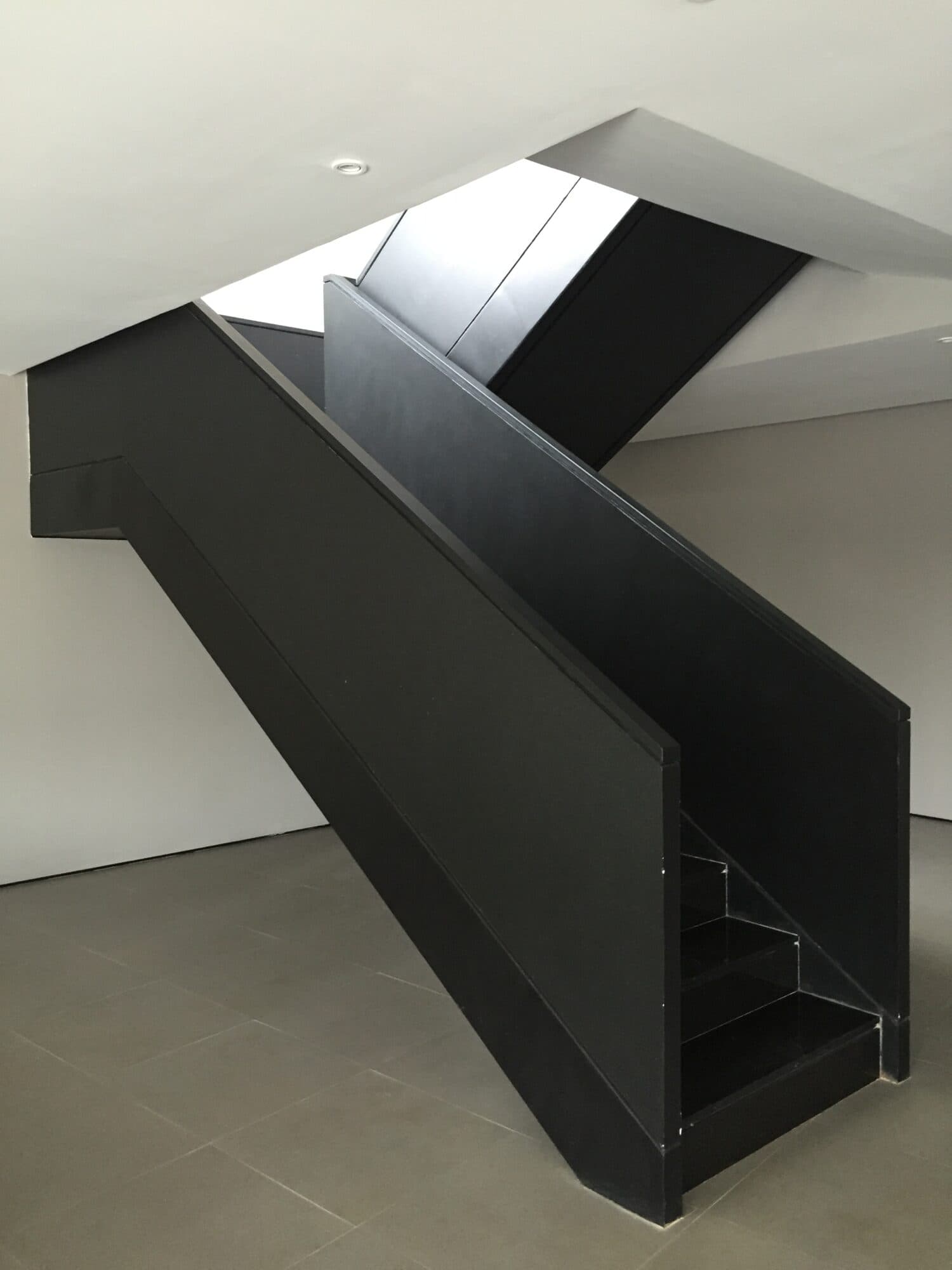 Os projetos de escadas de ferro podem ser desenvolvidos em qualquer formato (em L, em U, reta, caracol, curva e Santos Dumont) e estrutura (viga central, entre vigas, sobre triângulos e com viga em cascata).