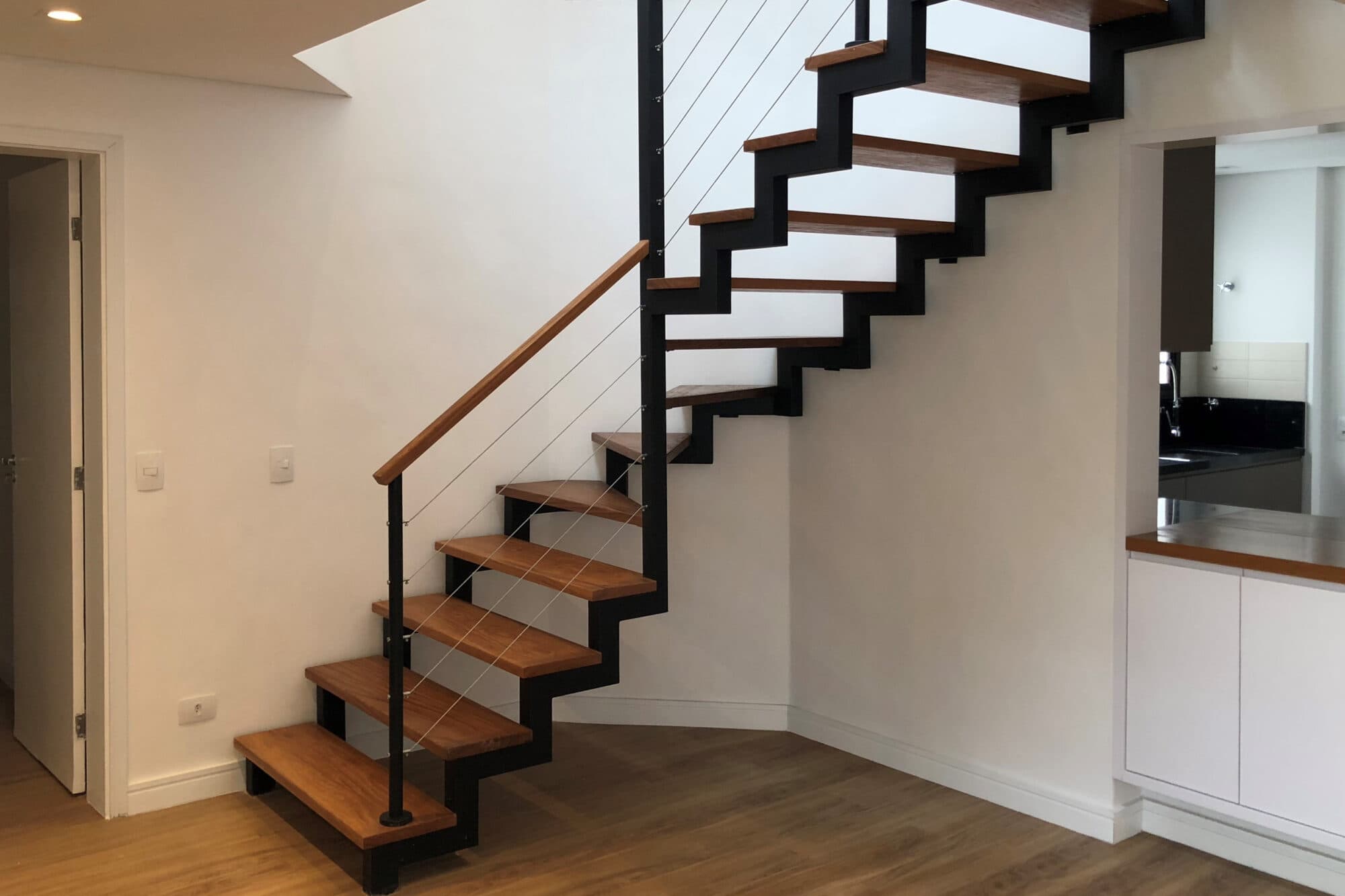 Por ocupar um volume de espaço bem menor do que a escada reta, por exemplo, esse modelo é muito utilizado em casas e apartamentos duplex, em que geralmente o espaço é reduzido.