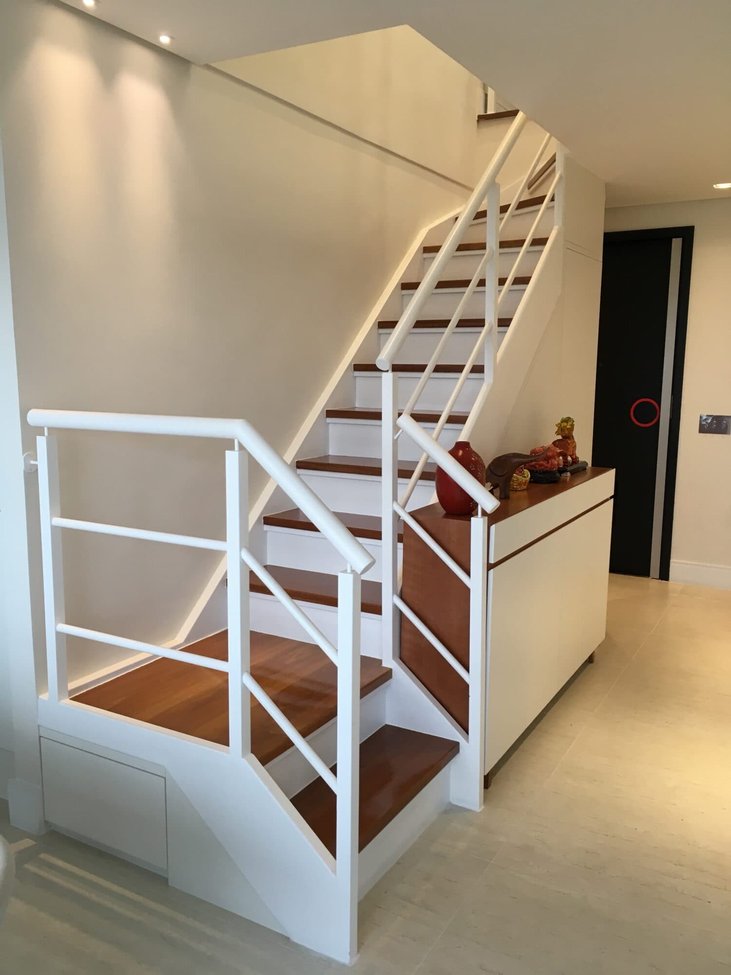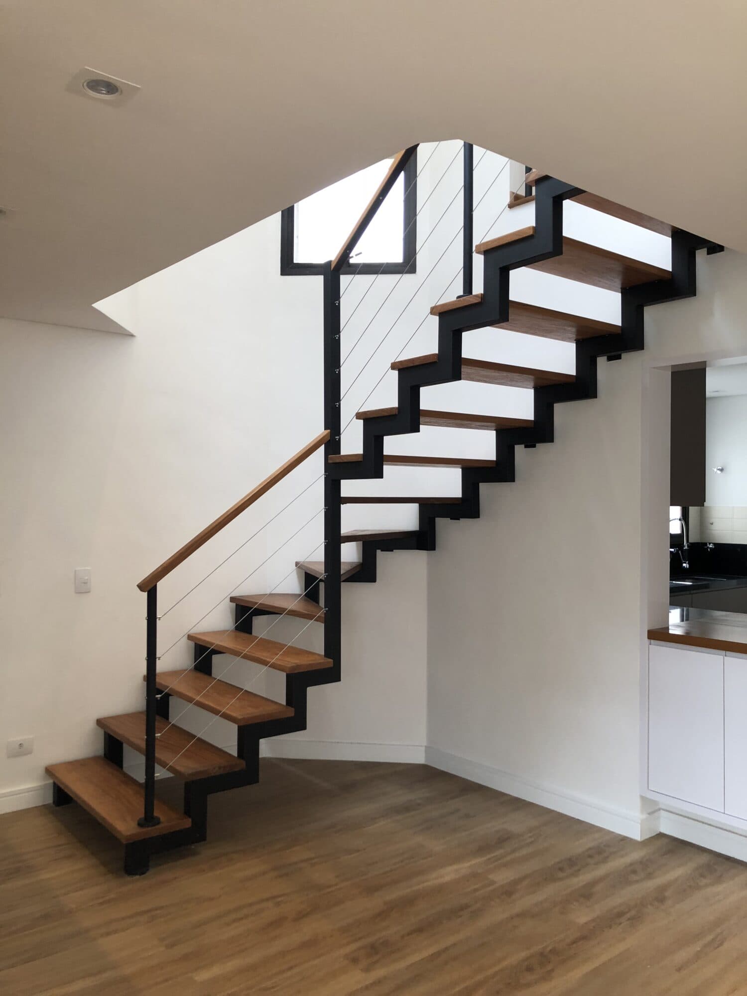 Em geral, a escada em L é instalada em um canto de parede, configurando-se como uma das opções mais indicadas para espaços pequenos. No entanto, esse modelo pode ser aplicado de diversas formas e posições, dependendo do projeto de arquitetura do ambiente.