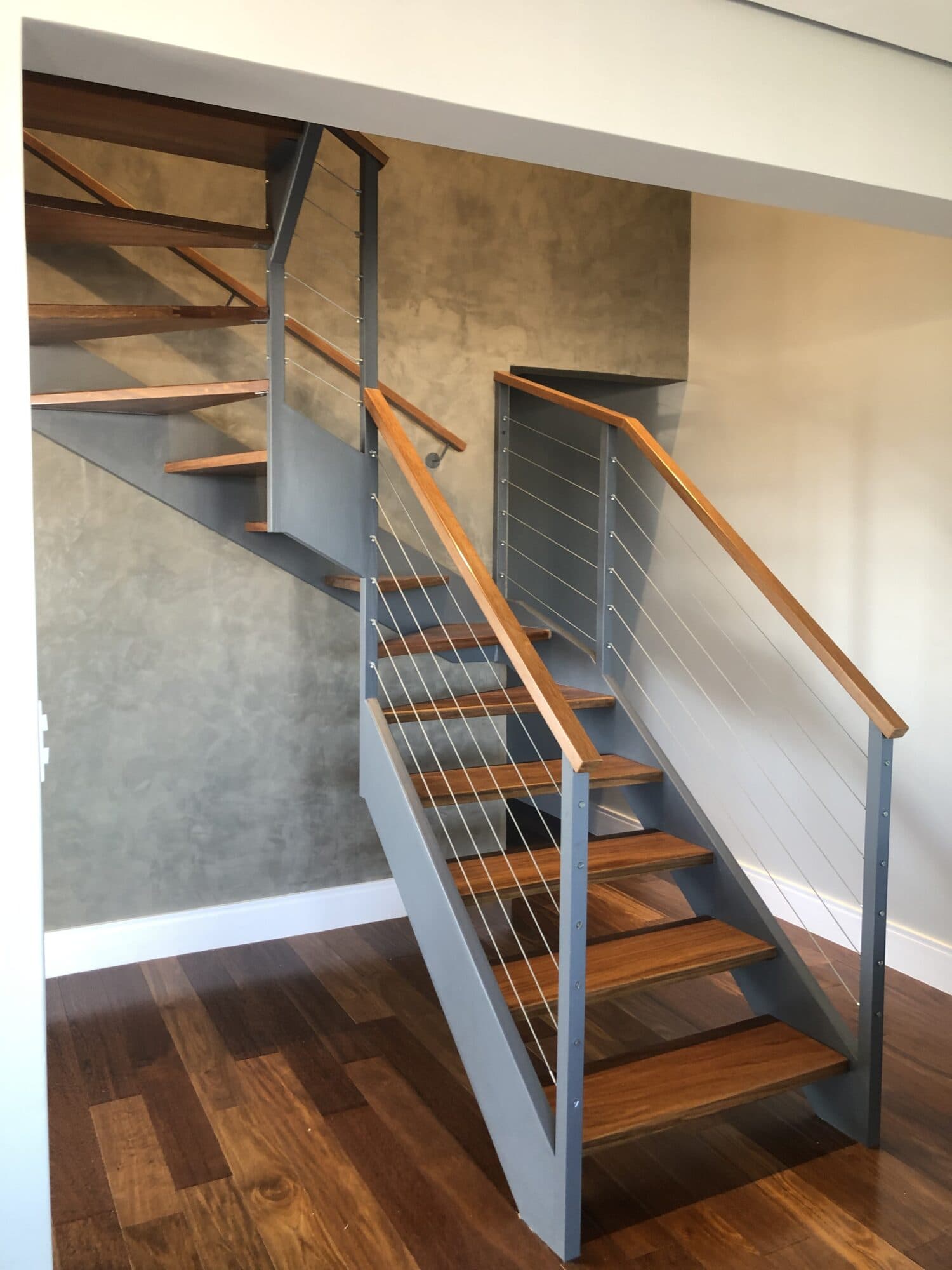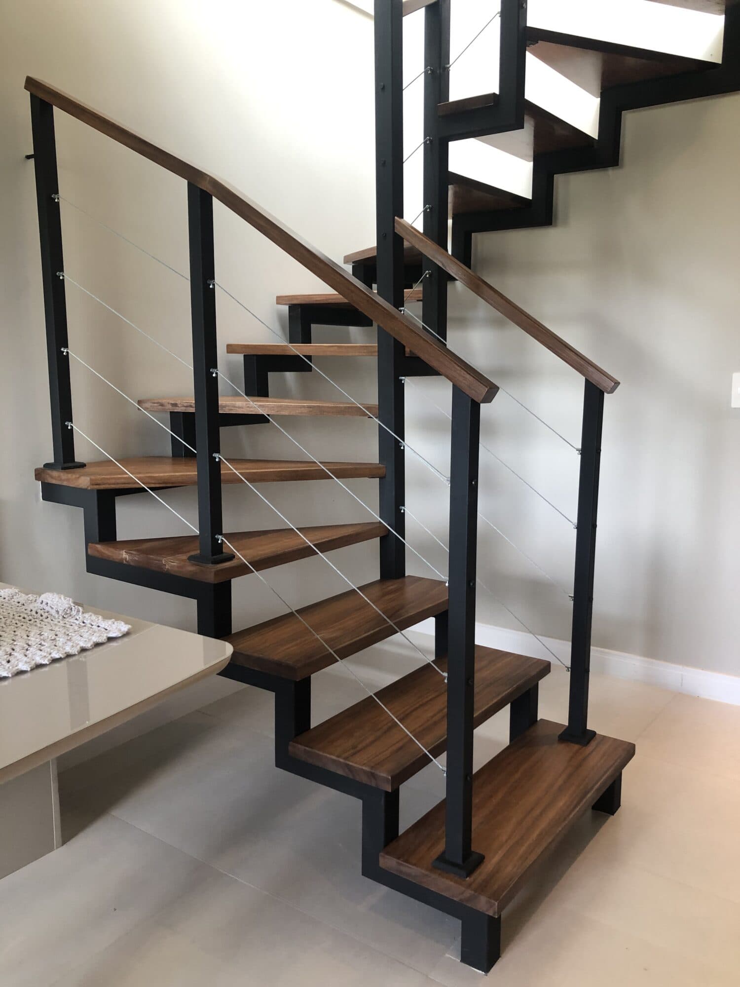 Nossas escadas mistas são visualmente bem leves. Como recebem os degraus em madeira, são escadas prontas, não precisando de instalações posteriores de corrimãos ou degraus. Podemos entregar também preparadas para receber vidros e corrimãos especiais.
