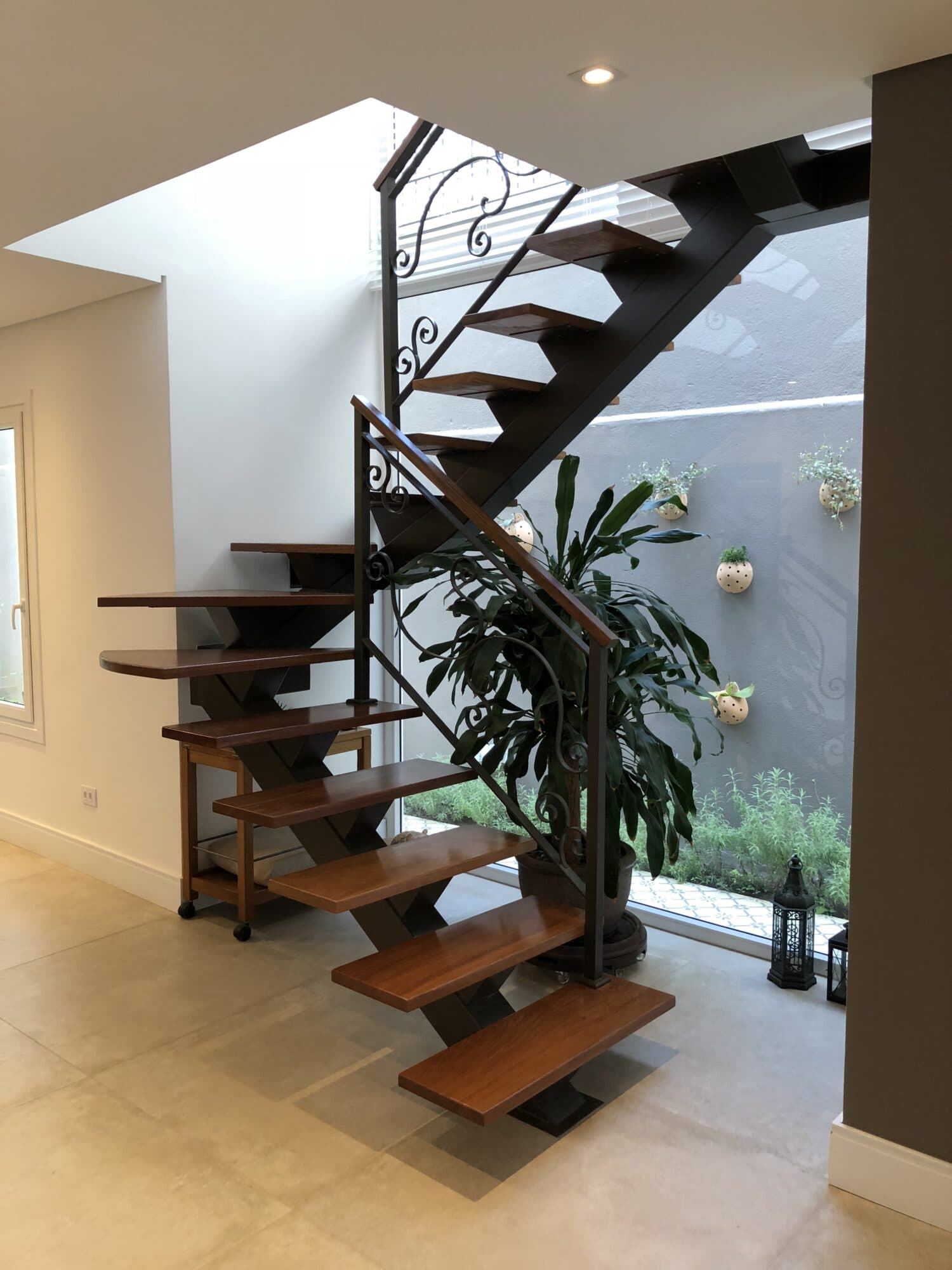 Numa escada mista, normalmente, temos a estrutura e corrimãos metálicos, com os degraus em madeira.